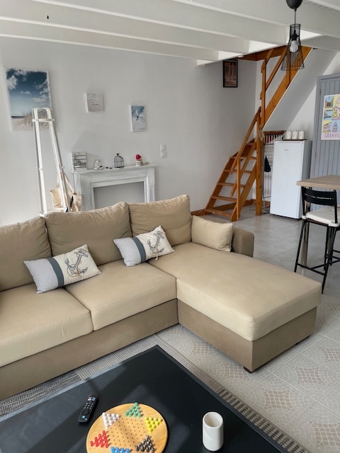 Studio de 35 m2 refait à neuf, à 100 mètres de la plage et ses cabines. Très sympa, agréable facile à vivre. Il se compose d’un coin cuisine, un coin chambre, une belle pièce de vie avec télévision, wifi, bureau et une salle de bain (les serviettes et les draps sont fournis). Le studio s’ouvre sur une terrasse avec salon de jardin. L'hébergement n'est pas accessible aux personnes à mobilité réduite en raison des marches pour accéder au logement et à la salle d'eau.