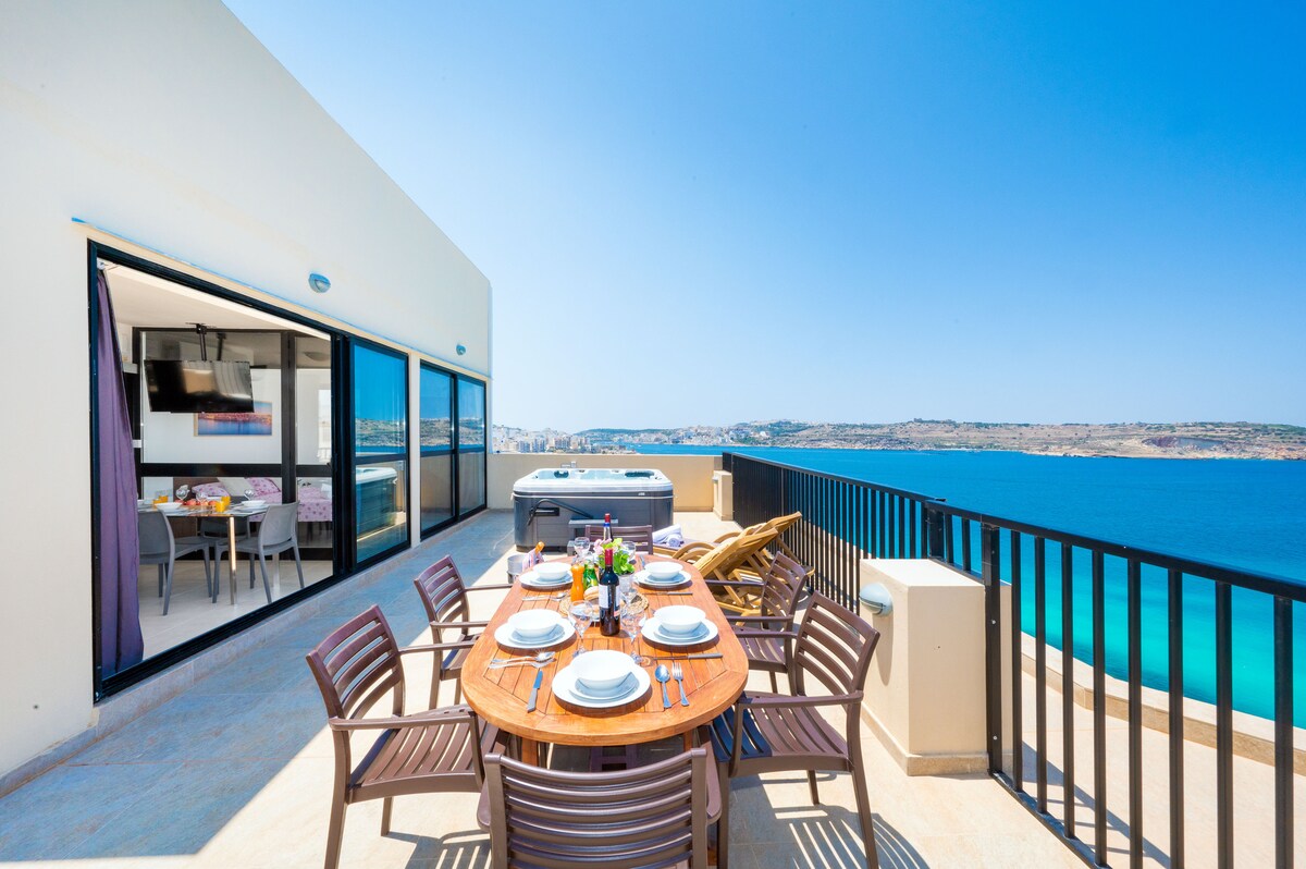 Красиві, просторі, сімейні та зручні для роботи апартаменти з краєвидом у найпопулярнішому житловому районі Мелліхи. Квартира повністю обладнана кондиціонером і має 2/3-місне приватне джакузі на терасі. Гості також мають доступ до повністю обладнаного тренажерного залу в тій самій будівлі. Квартира знаходиться в 15 хвилинах ходьби від найбільшого піщаного пляжу Мальти (2 хвилини на автомобілі) і відносно близько до всіх зручностей, включаючи супермаркети, магазини, перукарні тощо.