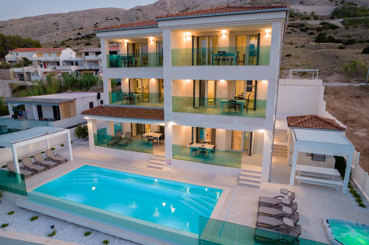 Відкрийте для себе віллу Danza del Mar через люкс DRAMA**** з гідромасажною ванною, басейном з підігрівом, швидким інтернетом STARLINK і захоплюючим видом на море, розташований всього в 150 м від пляжу та барів. Центр Віра знаходиться всього в 10 хвилинах ходьби по морській набережній. Підніміть свій відпочинок на новий рівень! Також доступно: газовий барбекю, телевізор із плоским екраном, балкон, приватна парковка
