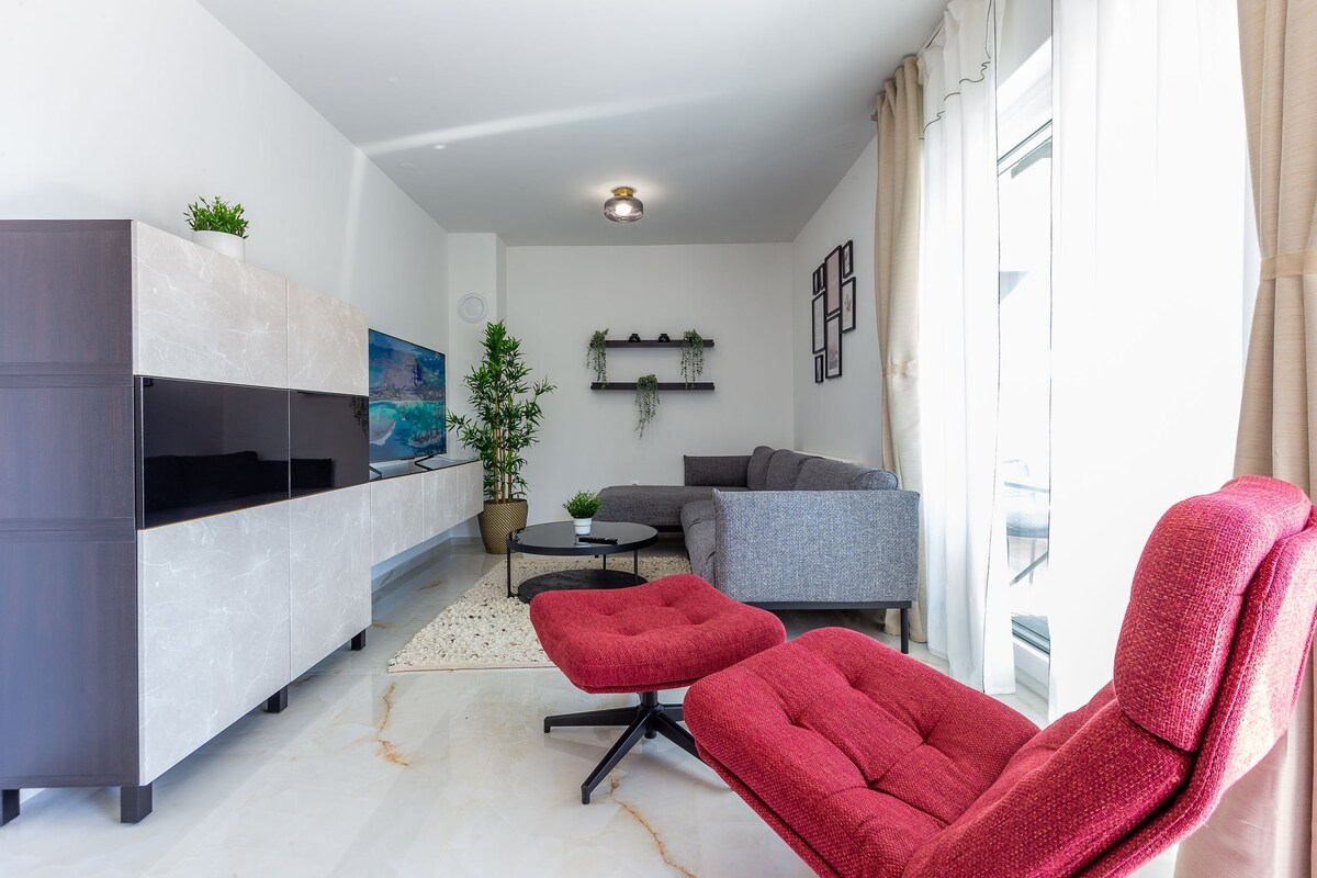 Ця сучасна квартира розташована в сучасному будинку. У квартирі є дві спальні з двоспальним ліжком, і кожна кімната має власний телевізор. У квартирі є сучасна вітальня з диваном, який призначений лише для відпочинку та відпочинку. Кухня сучасно оформлена, з усією кухонною технікою, мікрохвильовою піччю, духовкою, індукційною плитою, посудомийною машиною, посудом, чайником,холодильником, морозильною камерою, кавоваркою. Кухня обладнана кондиціонером і вітальня.