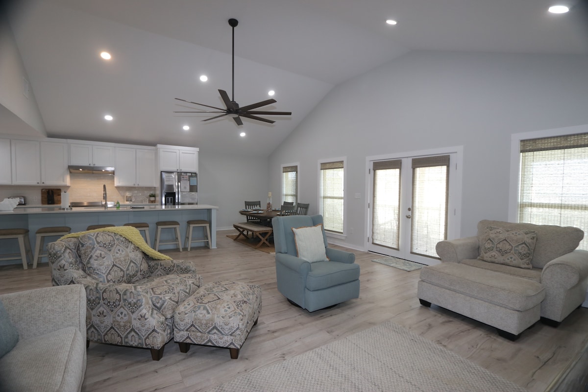 Спостерігайте за сходом сонця над пляжем Гранд-Айл зі свого ґанку, що виходить на затоку, а потім вирушайте приватною стежкою на день серфінгу та відпочинку на піску. Цей повністю відремонтований будинок з 8 спальнями пропонує великим групам достатньо місця для приготування їжі, спілкування та відпочинку – як нагорі у відкритих вітальнях, так і внизу на критій терасі (призначеній для варіння морепродуктів і сімейних пікніків). Магазини, бари та ресторани знаходяться на відстані кількох хвилин ходьби/їзди, що робить це місце ідеальним для пляжного відпочинку для всієї команди.