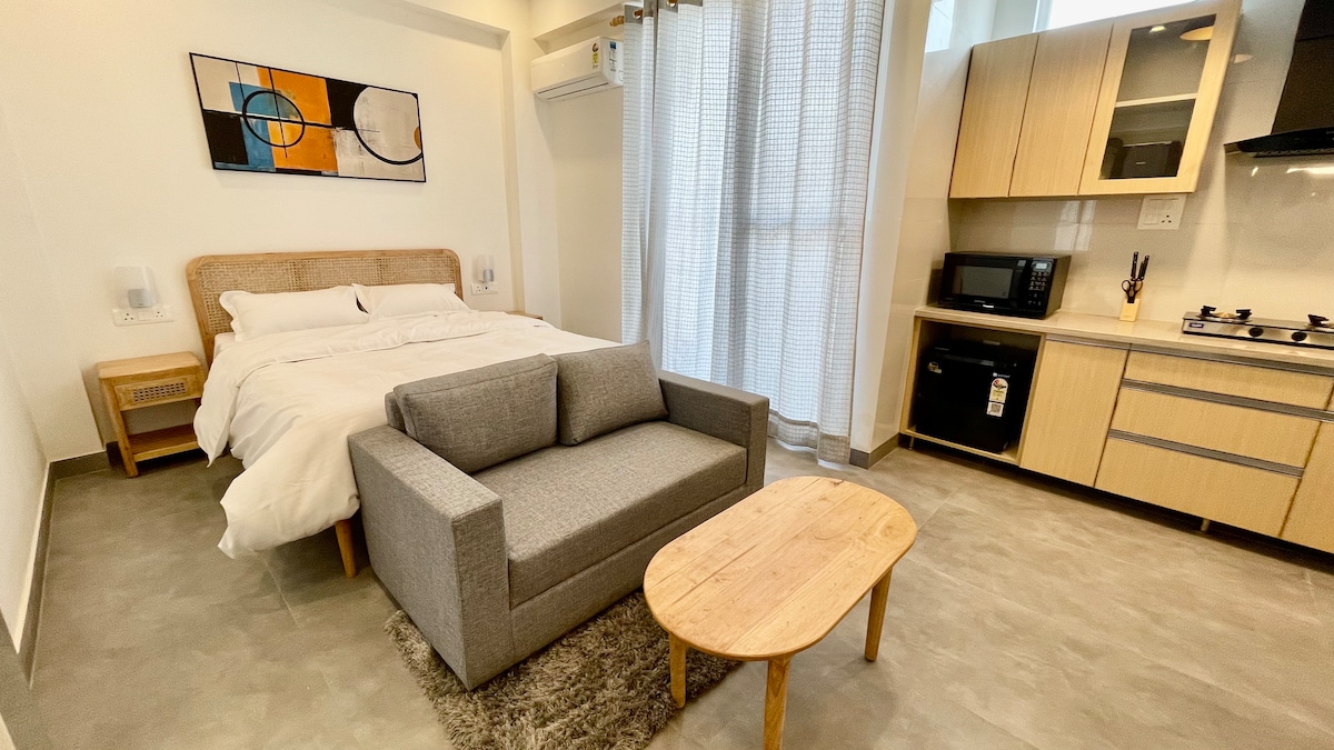 Відчуйте комфорт і стиль у помешканні, створеному для роботи та відпочинку. Відпочиньте на ортопедичному матраці Wakefit і насолодіться теплим освітленням. Залишайтеся продуктивними завдяки ергономічному робочому простору та розслабляйтеся за переглядом улюблених програм на двох 42-дюймових телевізорах. У суміжній ванній кімнаті є туалетні приналежності преміум-класу та дзеркало з підсвічуванням. Готуйте без зусиль на повністю обладнаній кухні. Відпочиньте на дивані в помешканні, де ідеально поєднуються спокій, продуктивність і стиль життя.