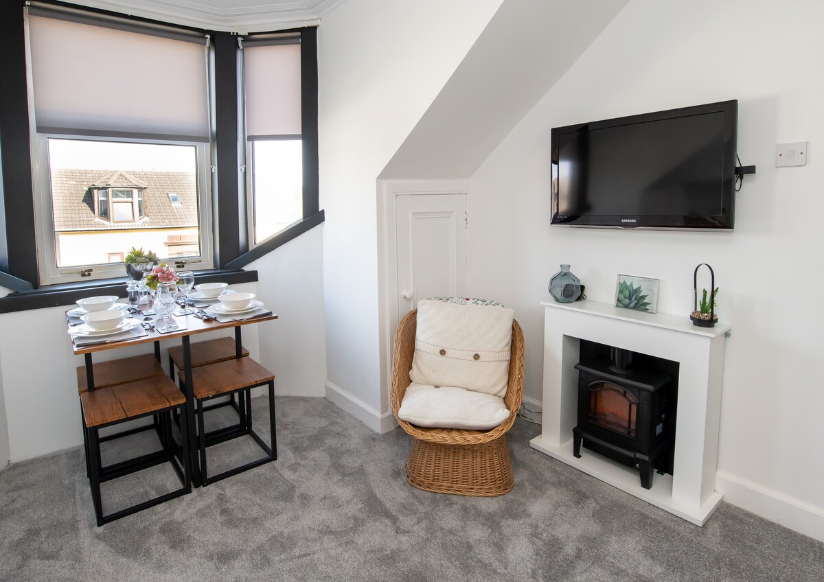 Ласкаво просимо у нашу яскраву, простору та нещодавно відремонтовану квартиру на верхньому поверсі, розташовану в центрі Гурока з приголомшливим видом на узбережжя Клайда. Розташована в декількох хвилинах ходьби від безлічі транспортних сполучень, барів, кафе, ресторанів та магазинів. Для вашого комфорту ми надаємо якісні матраци, високошвидкісну оптоволоконну широкосмугову мережу, кавоварку Tassimo, ароматні туалетно-косметичні засоби Arran, телевізор LG HD TV з Sky, Netflix, Disney+ тощо, сучасні меблі та засоби для прання.