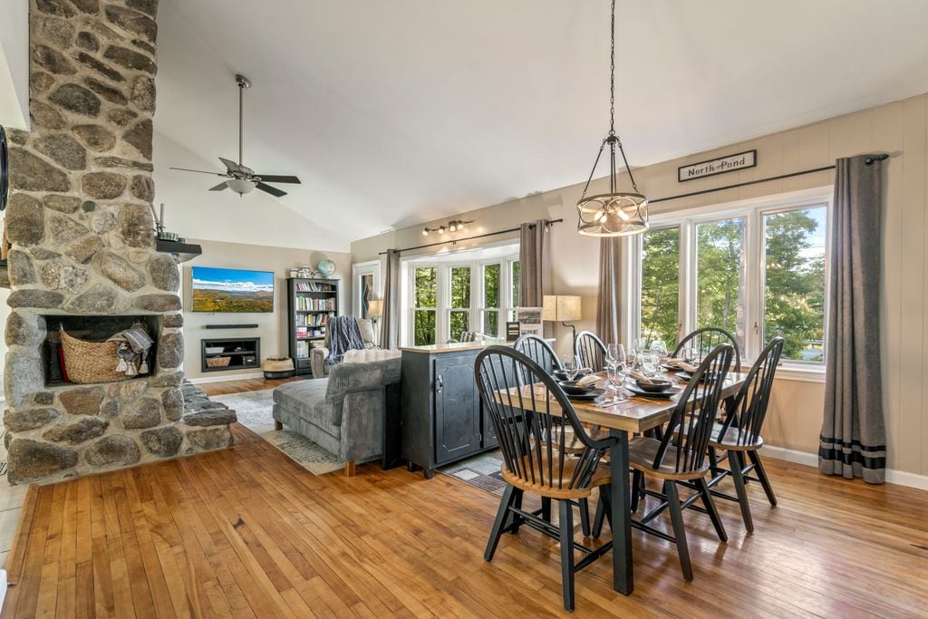 Розташований вздовж Головної вулиці, цей чудово відреставрований будинок на березі озера мав приватний причал і двір з видом на озеро. Приходьте насолоджуватися літом на озері з нашими каное, байдарок і кукурудзяними дірками. Взимку катайтеся на ковзанах у передньому дворі та катайтеся на лижах на Санді-Рівер (20 хвилин) або на горі Абрамс (5 хвилин). Будинок пропонує високошвидкісний інтернет, смарт-телевізор і сучасні зручності. Спеціальний обідній куточок, спеціальна кухня та сучасна, але затишна обробка.