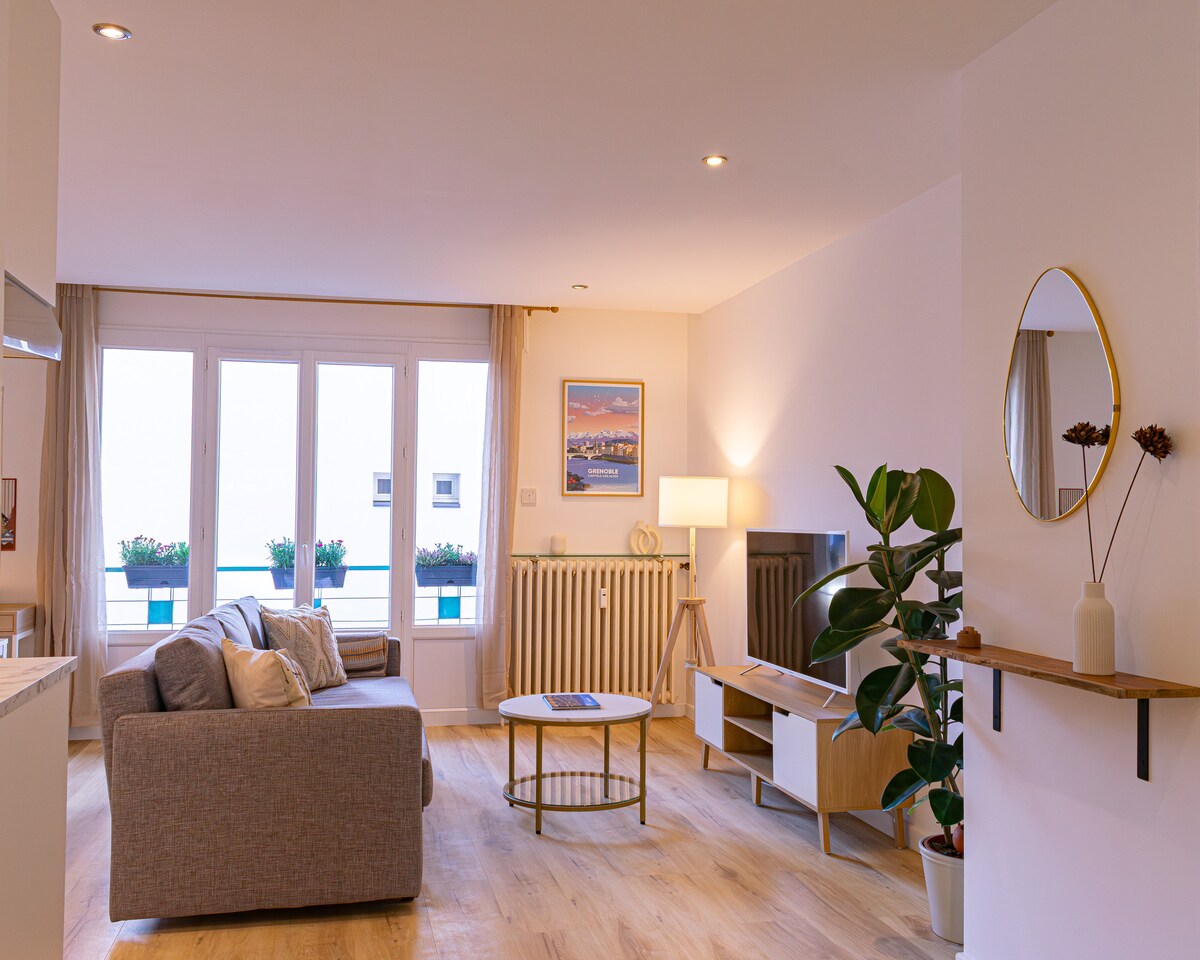 ❄ FLOCON – дизайнерська квартира з кондиціонером і великою кількістю світла в центрі Гренобля, повністю відремонтована в 2024 році. Розташоване на 5-му поверсі з приголомшливим видом на гори та балконом з видом на внутрішній двір, що гарантує спокій у центрі міста. Приватна парковка в підвалі, недалеко від трамвая Gustave Rivet. Це помешкання ідеально підходить для відпочинку або ділової поїздки. Це помешкання поєднує в собі сучасний комфорт, теплу атмосферу та спокій.
