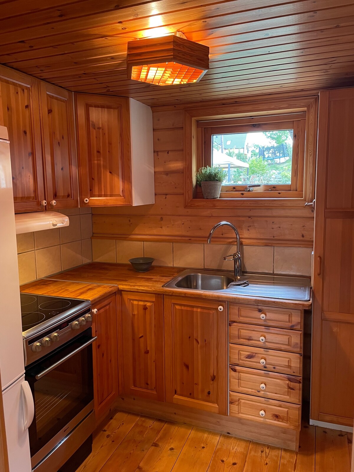 Унікальні помешкання на Airbnb - три каюти, які розбивають будинок у стилі модерн з величезними вікнами та балконом навколо будинку. Чудовий сад у бік лісу. Відчувається, ніби ви сидите в будиночку на дереві, коли стоїте у вітальні. - Сауну орендувати в саду. - 450 метрів до озера. - Підйом на стіну, батут і сленг на задньому дворі. - Чудове підключення до Інтернету. Дві спальні та величезна кухня/вітальня з каміном. Ідеально підходить для 4-5 гостей або сім 'ї, яка любить готувати, грати та плавати.