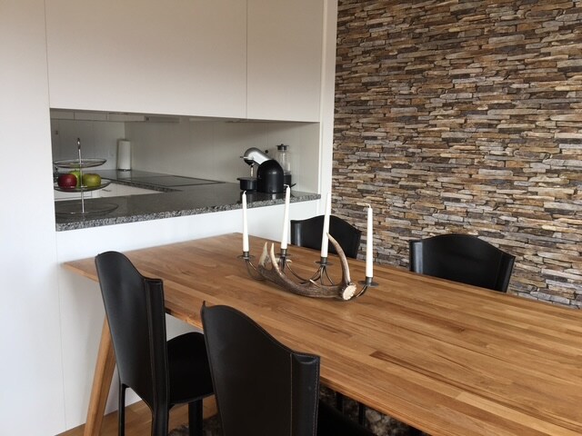 Бажаєте поєднати відпочинок в красивій гірській природі з добре обладнаною сучасною квартирою для відпочинку? Можливо, навіть трохи попрацюйте між ними - без проблем завдяки стоячим столам, офісним стільцям і великим екранам. На кухні є повне обладнання з келихами для вина St. Moritz, дерев 'яними тарілками Енгадіна, посудомийною машиною, духовкою, а також відпарювачем. У будинку є велосипед і лижна кімната, а також пральня, включаючи сушильну машину та Secomat. У квартирі також є пральна машина.