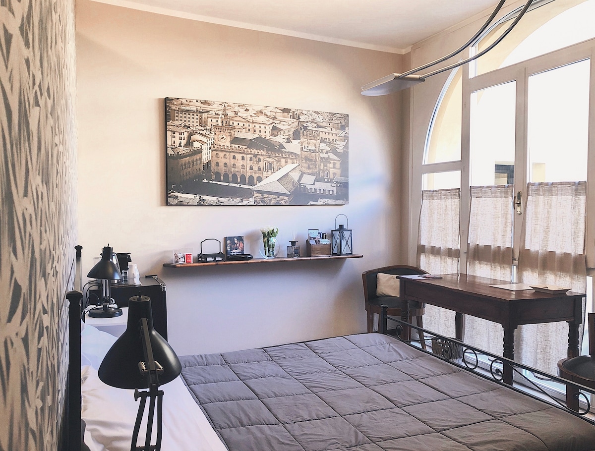 Затишна і тиха квартира на першому поверсі, в історичному будинку, розташованому в центрі міста. Дрібно мебльована , вона складається з двоспальної спальні, вітальні з двоспальним диваном-ліжком, обладнаної відкритої кухні, ванної кімнати. Як із вітальні, так і з спальні ви отримуєте доступ до приватної, тихої та зарезервованої тераси. Він розташований в декількох кроках від двох веж Болоньї, від району Університету. Квартира знаходиться в 15 хвилинах ходьби від Центрального вокзалу Болоньї.