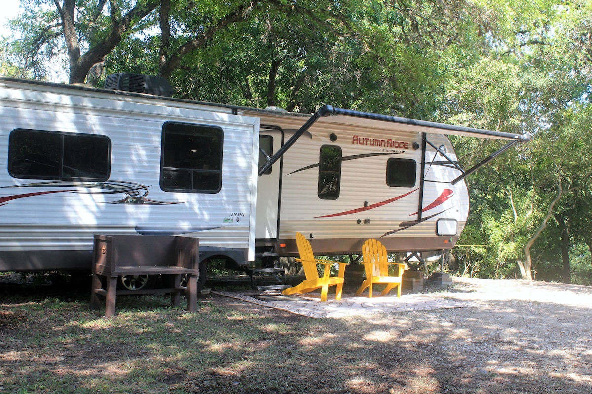 Ласкавовано на нашому розслабляючому, блаженному фургоні! Це спокійне помешкання - ідеальний відпочинок для пар або самотніх людей. Розташоване на нашій приватній території площею 4 акри, це помешкання має всі базові зручності для комфортного перебування, зокрема спільну зону для барбекю та будинок на дереві! Ми знаходимося в самому центрі Техаської Хілл-Кантрі, всього в 5 хвилинах від амфітеатру Whitewater, спуску на надувних кругах на річці Horseshoe та в 25 хвилинах від знаменитого аквапарку Schlitterbahn у Нью-Браунфельсі!