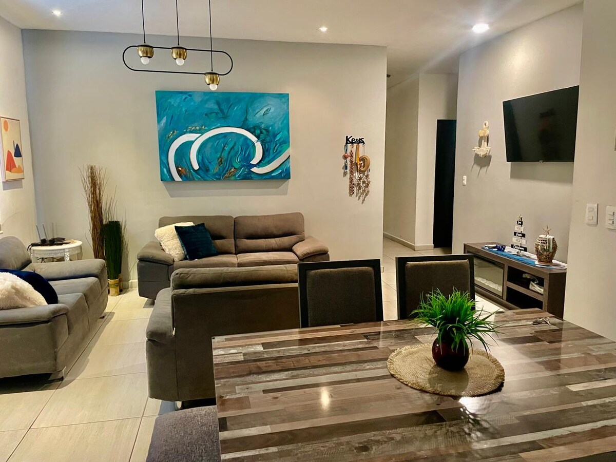 Зручний повністю мебльований будинок ідеально підходить для насолоди прекрасними пляжами Сан-Карлоса та його різноманітними місцями для відвідування. Включає кухню з плитою, мікрохвильовою піччю, блендером, тостером, кавоваркою, посудом, холодильником та всім необхідним посудом для приготування їжі. До вартості входять 3 телевізори Smart TV із сервісом Netflix та бездротовий Інтернет. У нас є 3 ліжка та диван-ліжко. Тут є 3 міні-спліти, приватна парковка та задній двір із барбекю, перголою та великим столом. 4 пляжні крісла.