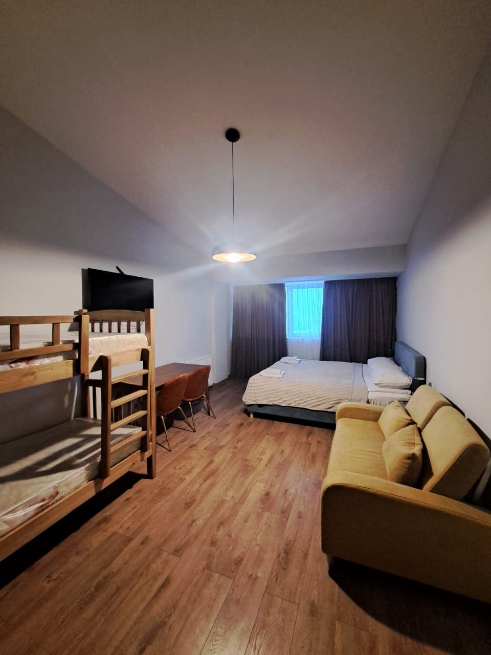 Зручна квартира-студія в Новому Гудаурі в будівлі Alpic, всього в 100 метрах від канатної дороги Гудаурі. У будівлі є ресторан із грузинською кухнею, поруч є бари, магазини та пункти прокату лиж. Прямо біля нового парку «Червона лисиця» (відкриття в грудні) — каток, атракціони, музика, різдвяний ринок і смачні закуски. У квартирі для 3 осіб є Wi-Fi, телевізор, рушники, постільна білизна та шафки для лижного спорядження. До послуг гостей цілодобова стійка реєстрації. Ідеально підходить для любителів зимових видів спорту та дослідження Грузії.