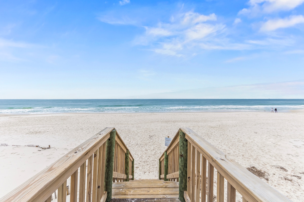 Ласкаво просимо до «Золотої години»! Цей нещодавно відремонтований відпочинок на узбережжі Галф-Шорс знаходиться всього в 100 кроках від пляжу з приватним доступом. Насолоджуйтеся приголомшливим видом на воду з кожної спальні та захоплюючими закатами щоночі. Кількість 🏡 місць: 10 (максимум 8 дорослих) | 4 спальні | 3 ванні кімнати 🍽️ Простора кухня | Дві вітальні | Обгорнута тераса 🌊 Пляжне спорядження, сапсерфінг, байдарки тощо! Розташоване на тихому бульварі Вест-Біч - ваш ідеальний відпочинок на узбережжі