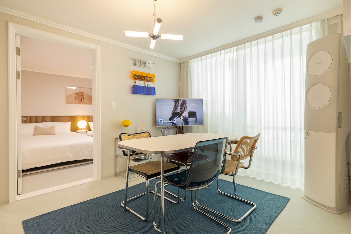 Стильний двоповерховий лофт пентхаусу, ідеально підходить для пар або молодих сімей, які відвідують Сеул на відпочинок. Друга спальня пропонує автентичний корейський досвід сну на татамі (включаючи матрац). У квартирі є повністю обладнана кухня з посудомийною машиною, найсучаснішою пральнею+ сушильними машинами, домашнім офісним приміщенням, а також 2 ванні кімнати (1 душ + 1 ванна). Зручності, зокрема повністю обладнаний тренажерний зал, басейн і гаряча ванна+сауна (лише для довготермінових бронювань). Лінії метро 2 і 7 знаходяться в 3 хвилинах ходьби (вихід 5)