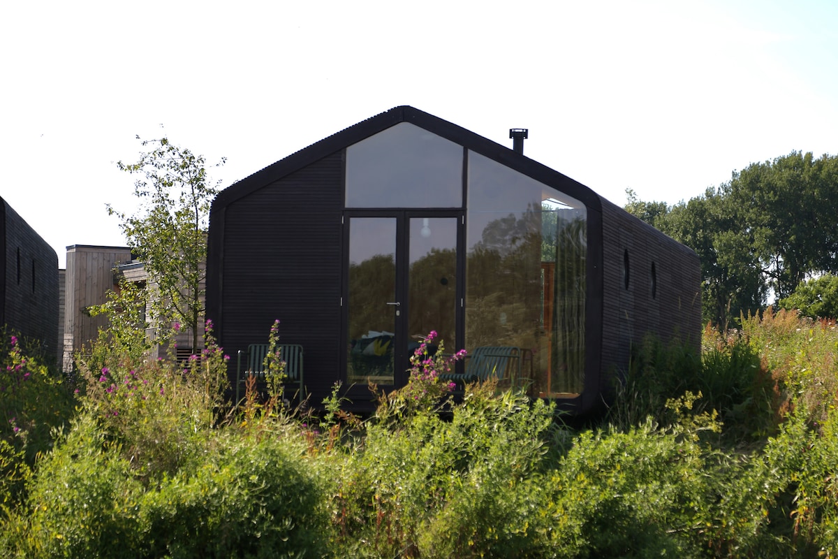 The most famous tiny house in the Netherlands. Spacious at 45 m², cozy, and unmistakable with its sloping roof and wooden interior. The large windows at both the front and back, leading to two private decks with lounge chairs, flood the house with natural daylight. In this cabin, you can fully enjoy the sun with friends and family. In addition to a queen-size bed in the master bedroom or a sofa bed in the living room. If you prefer a bunk bed, you can request this based on availability.