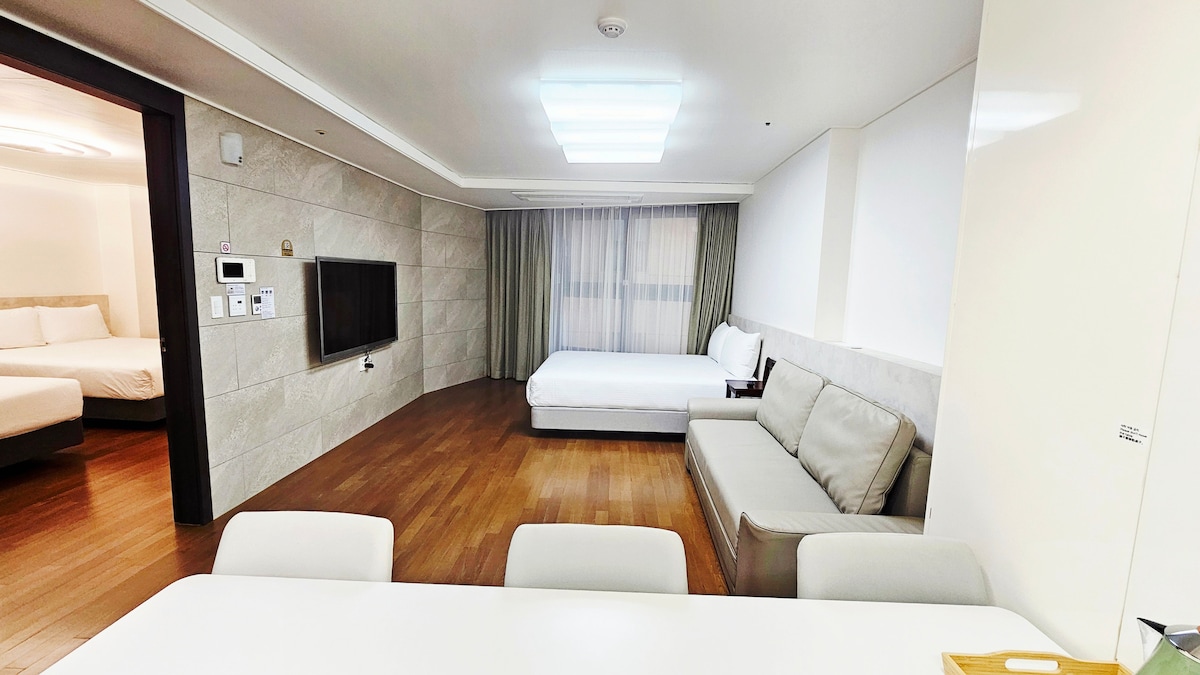 Про■ кількість гостей * Стандартний номер для 4 осіб: 2 ліжка queen-size * У разі бронювання для 5–8 осіб: надається додаткове ліжко або надувний матрац на підлогу та постіль * Немовлята віком до 24 місяців: не враховуються в кількості гостей (постільна білизна не надається) Чого очікувати В межах ■ помешкання «Якість сімейної подорожі залежить від помешкання» До зустрічі, Хендей! Це не просто перебування – це ідеальний відпочинок. ✨ Чому Avianto? ✔ Ідеальна композиція простору Дві ванні кімнати, щоб не чекати у великій черзі, а також просторий і приємний простір (2 спальні + 2 ванні кімнати + 2 гардеробні + кухня) 30 пхьонг (98 м²) ✔ Неперевершене відчуття відкритості Відчуття простору завдяки високій стелі (2,8 м) у приміщенні. ✔ Зручності паркування Зручна та затишна стоянка, що є рідкістю в Хеунде. ✔ Преміальний сон У всіх спальнях матраци Simmons і готельна постіль ✔ Управління відповідальністю Прибирання пилососом і паром Kärcher, етап 2, ретельний догляд від спеціалізованого персоналу лише для однієї команди на день Відпочиньте разом, насолоджуйтеся перебуванням у Avianto Haeundae. До зустрічі. Avianto.