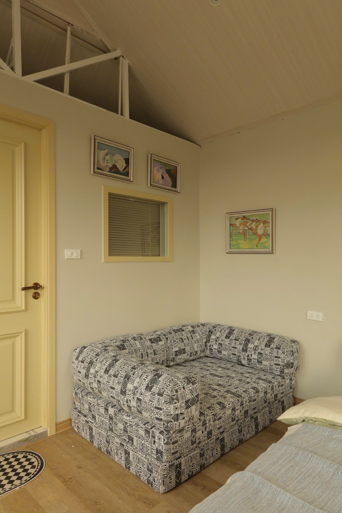 Простора кімната, наповнена природним освітленням, що пропонує яскраву та розслаблюючу атмосферу. До послуг гостей зручне велике ліжко, зручний диван-ліжко для відпочинку або додаткових гостей, а також базова кухня для швидкого харчування. Для розваг у номері є сучасний проектор, який ідеально підходить для вечорів у кіно або відпочинку з друзями та родиною.