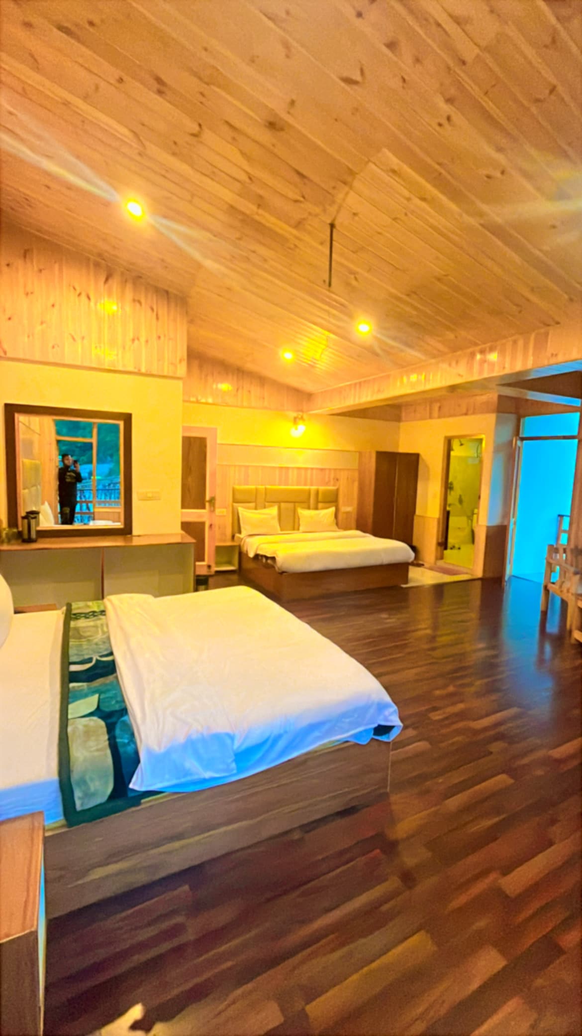 Super cozy Duplex Suite WITH WINDOWS for mountain view. One bedroom on lower level with one washroom and a wooden stairs to upper level bedroom. it has a sofa set on upper level where 4-5 guest can sit and enjoy food. ROOM INCLUSIONS : -Comp Mineral water on arrival -Free WI-FI , parking Free Breakfast (Morning 8.30 till 10.30am)served at dining area only (No Room Service) -Heater at additional 300/- rs charge Room is on 3rd Floor Note *No provision of lift*
