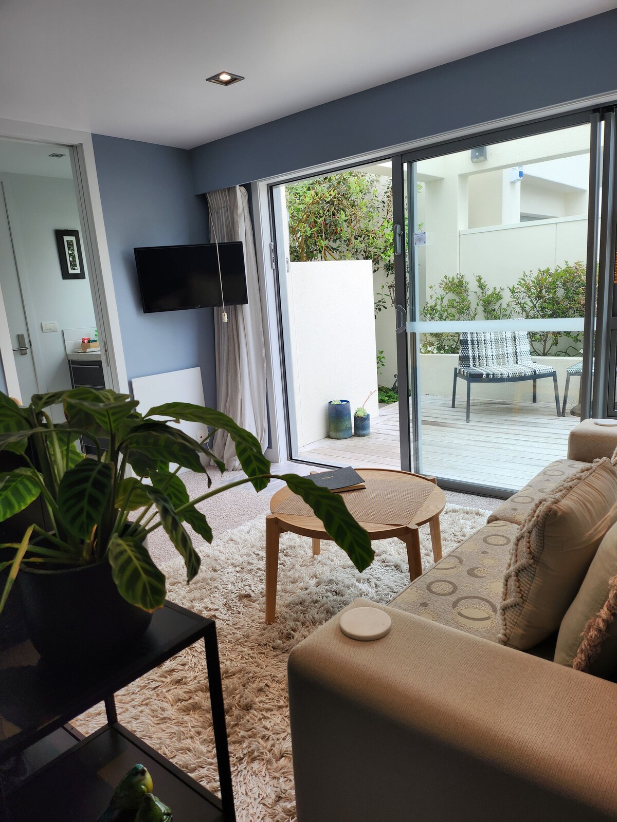 З власним приватним патіо насолоджуйтеся спокійним перебуванням у цій сучасній квартирі з 1 спальнею в центрі міста з окремим житловим та робочим простором. У вас є власна міні-кухня з холодильником і мікрохвильовою піччю для підігріву їжі. Спіть добре на ліжку Deluxe Superior King size з якісною білизною та красивою ванною кімнатою з плиткою. За потреби є двоспальний диван-ліжко для двох додаткових гостей. Безкоштовна парковка, приватна дорога, Wi-Fi, Netflix і YouTube. Аеропорт приблизно за 12 км на південь від Лейксайда.