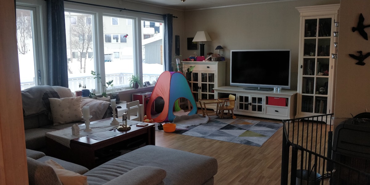 Квартира була завершена влітку 2023 року. Вона яскрава та сучасна і складається з кухні з усіма зручностями, вітальні з диваном та телевізором, ванної кімнати з великим душем, коридору та спальні з ліжком 150 см. Усі кімнати мають вікно з видом на гавань Хаммерфеста, Мелкьою та Хайю. Квартира знаходиться на боковій вулиці без руху транспорту, всього в 5 хвилинах ходьби від центру міста. На жаль, у нас немає паркінгу, оскільки вулиця занадто вузька.