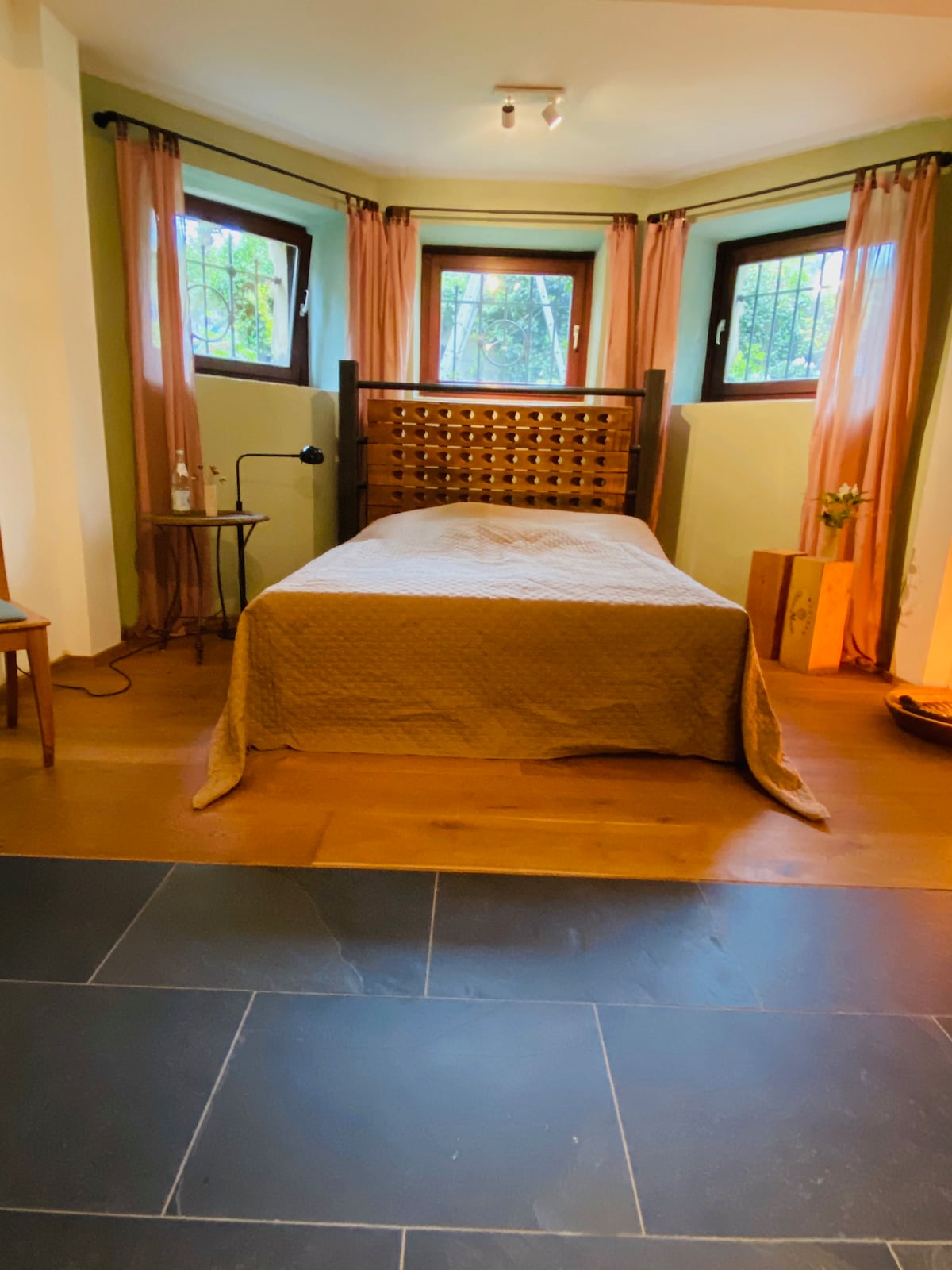 У прибудові нашого будинку, яка раніше використовувалася як практика, ця студія доступна для вашого ексклюзивного, приватного використання. Поряд із невеликим коридором із шафою для взуття та шафою для одягу є невелика ванна кімната з туалетом та душем. У великій, світлій вітальні є невелика міні-кухня (але НЕ повністю обладнана кухня) з раковиною. Розкладний диван може вмістити третю особу. За перегородкою середньої висоти розташоване двоспальне ліжко безпосередньо біля великого вікна.