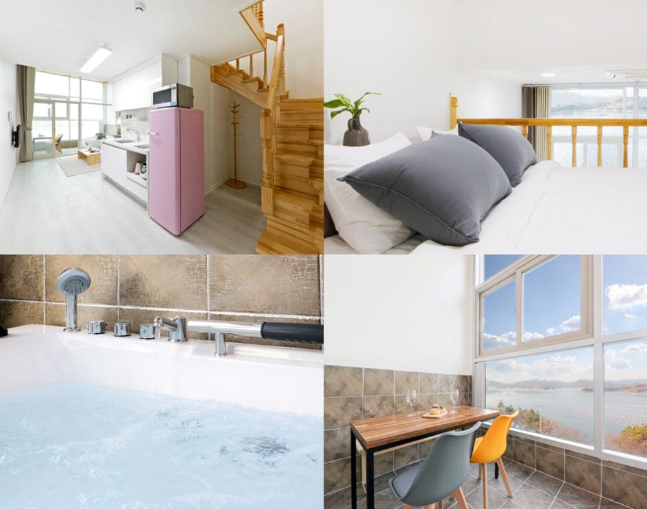 Це двоповерховий простір із вітальнею, кухнею, ванною кімнатою на нижньому поверсі та затишним помешканням з ліжком нагорі.Тут є вікно, де можна прилягти й побачити небо, тому дітям це дуже подобається. На вулиці можна спостерігати за заходом сонця з великого відкритого газону, і він славиться різними місцями зйомок, тому чудово робити фотографії ~ Шкода, що на фотографіях не видно справжніх пейзажів. Сидіти на гойдалках, сидіти за столом, випивати чашку кави та спостерігати за заходом сонця - це самообслуговування. Є зона для барбекю/басейн та джакузі (літо) Тут є кафе Geoje Hotple, тому ви можете поїсти (знижка 10%). За барбекю на вугіллі та спа-салон стягується окрема плата