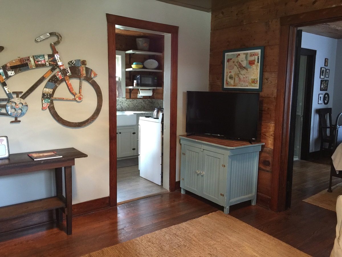Ця чарівно відреставрована квартира-гараж, збудована в 1922 році на деревах, сповнена природного світла та оригінального мистецтва. (Затемнені штори в спальні.) Повна кухня: плита та духовка, холодильник, пральна/сушильна машина. Вітальня з телевізором з Roku, шоу-таймом, преміум-каналами Столова/офіс Ванна кімната з душем або ванною (шампунь тощо; надається висока якість постільної білизни). WI-FI (сильний сигнал) 3 квартали від 19-ї вулиці (Хайтс шопінг і чудова їжа). За межами вулиці, на території закрита парковка.