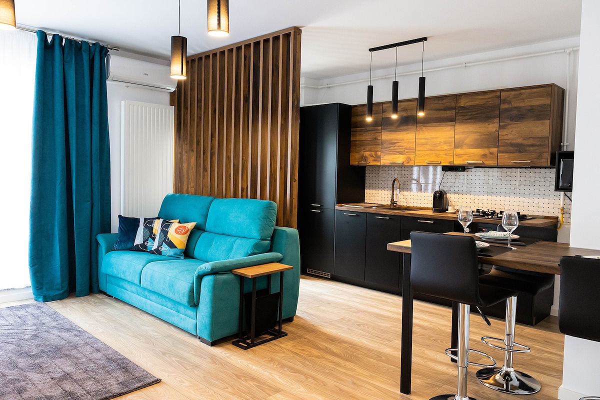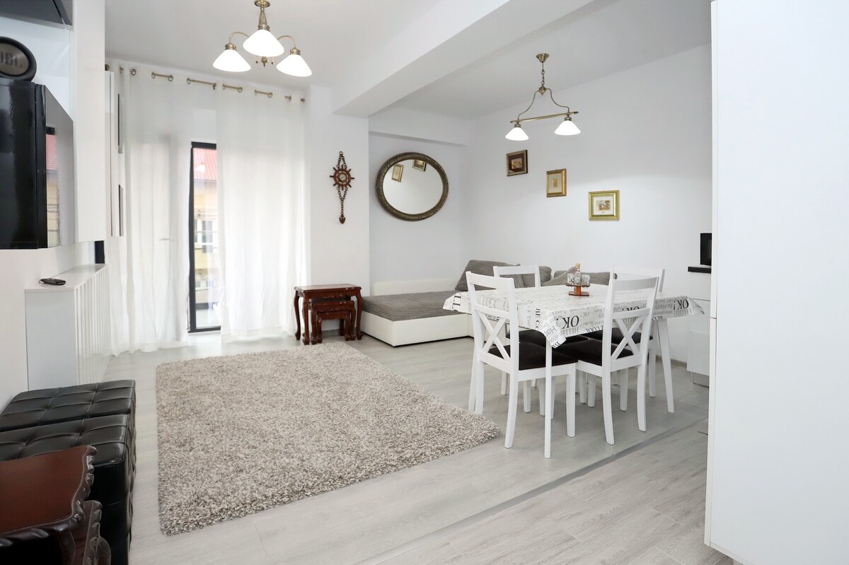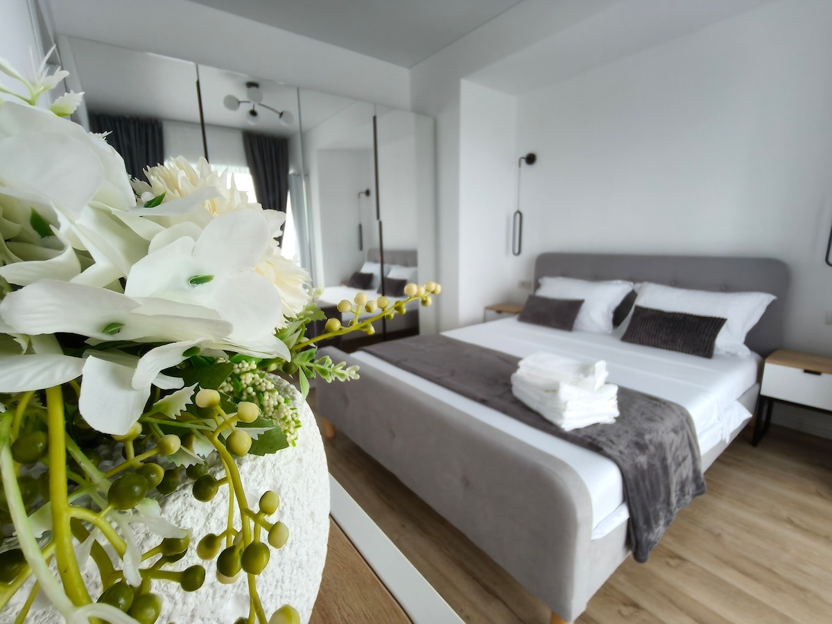 Apartamentul este o locatie ideala pentru a gazdui 4-5 persoane fiind complet mobilat si utilat cu finisaje premium 🛏 1 pat marime KING size+canapea extensibila de 2 -3 persoane ! 🍽 Bucatarie echipata complet 🖥Smart tv +wifi+netflix ❄Aer conditionat 👗Masina de spalat rufe ☀️ Balcon spatios, echipat cu masuțã şi scaune . 🚗 Loc de parcare inclus - aflat in interiorul complexului(supraveghere video) Zona cluburilor şi plajele se afla la numai 15 min cu masina.