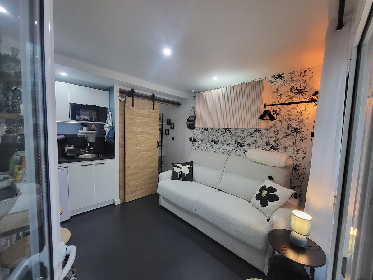 Оренда сучасного мебльованого будинку з художньою студією, що складається з 1 просторої спальні, душу, туалету та кухонної зони (мікрохвильова піч, кавоварка, чайник, тостер, невеликий холодильник). Можливість розігрівати страви, але не готувати. Немає електричної плити або духовки. Безпечна приватна стоянка Поруч з усіма магазинами (пекарня, супермаркет, банк...) Автобусна зупинка в 100 м до центру міста та печери Salle des fêtes "Robert Hossein" 400 м. Дуже тихий район