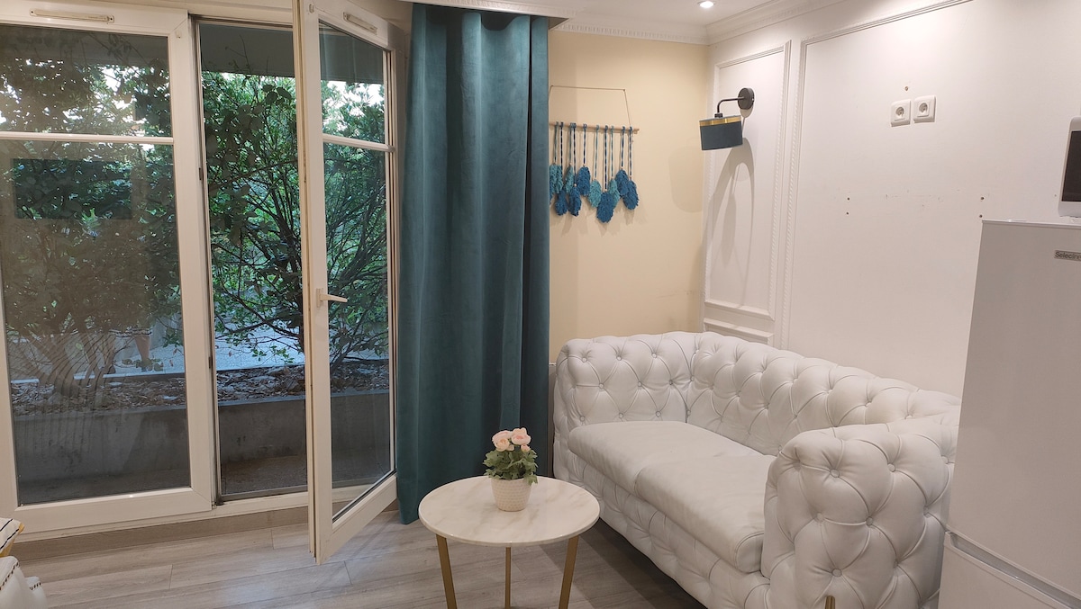 Яскраве, зручне, добре обладнане помешкання з садовою терасою, де можуть розміститися 2 особи, розташоване біля підніжжя трамвая T2, автобуса 72 та лінії метро 10 Помешкання Тип помешкання: студія Зона проживання: 25 м2 Вітальня→ : ліжко розміру King size (160x190 см - якість готелю), вбудована шафа, з робочим кріслом Кухонна → зона: повністю обладнана Ванна → кімната: душова кабіна, раковина, рушникова сушильна машина, окремий туалет