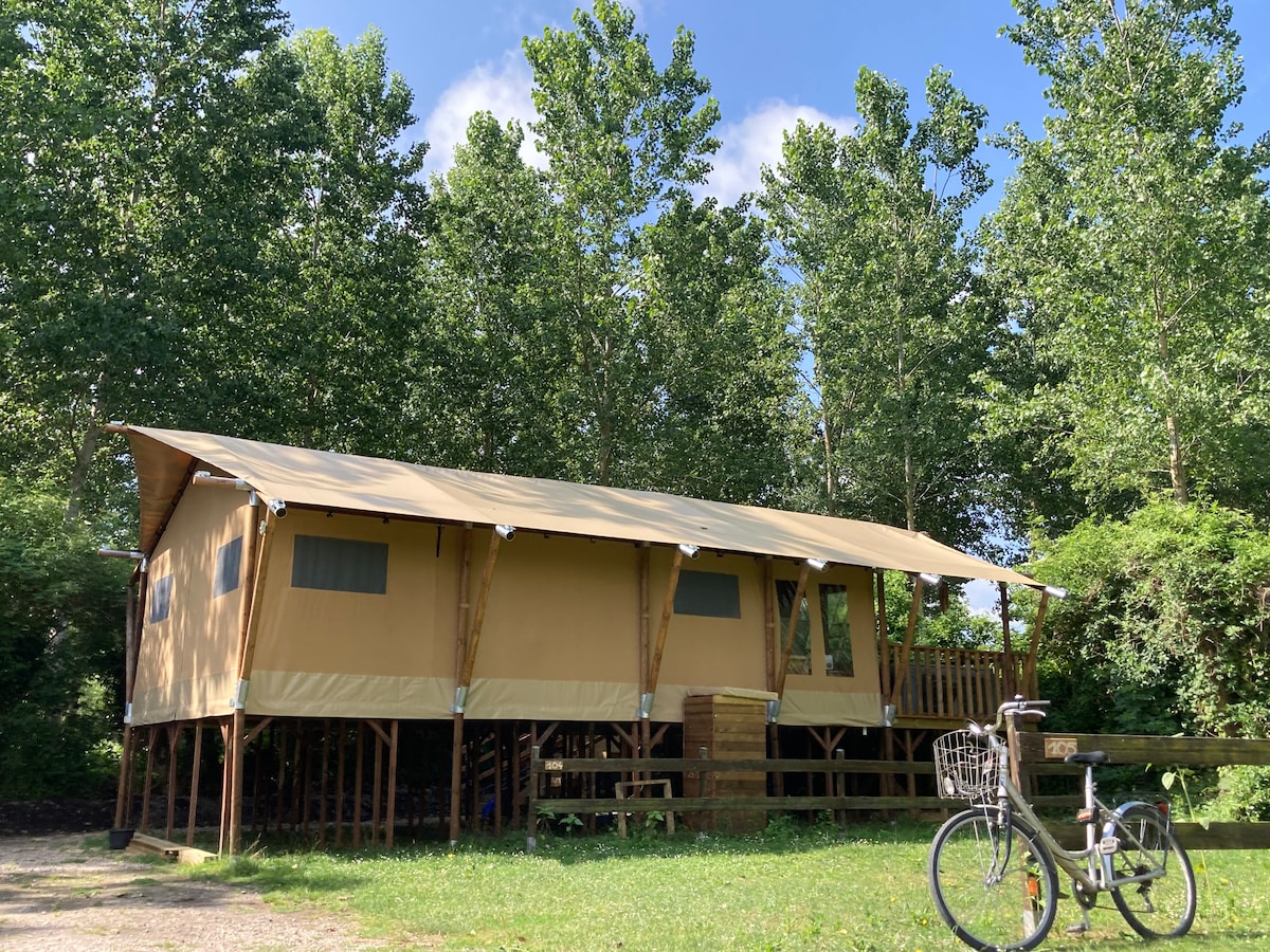Дивовижні враження чекають на вас у Camping de la Trye: 4 розкішні намети для сафарі XXL на ходулях на 7 осіб із терасою та великим спа-салоном XXL. З чудовим видом на природу, або на лузі, або на лісі та підліску! Ви будете вражені! Забудьте про свої турботи, приїжджайте і відпочиньте в племені в кінці нашого кемпінгу, поза зоною видимості, на краю кемпінгу.