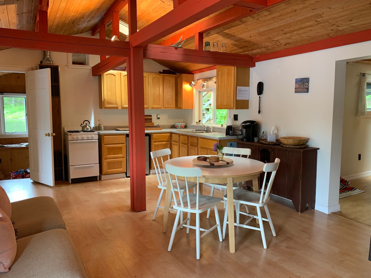 Це приватне, чарівне дерев 'яне помешкання ідеально підходить для вашого відпочинку! У спальні на 1-му поверсі є ліжко розміру Queen size, а в затишному лофті - повнорозмірний футон. Помешкання має простору ванну кімнату з душем та пральною/сушильною машиною. Насолоджуйтеся сільською, повністю обладнаною кухнею. Є 3 великих телевізора з плоским екраном, Інтернет 100 Мбіт/с з Roku, безкоштовне місцеве та міжнародне телефонне обслуговування, а також доступ до спільноти на березі озера з ігровим майданчиком, пляжем, басейном, тенісними кортами, стежками та снігоходами.