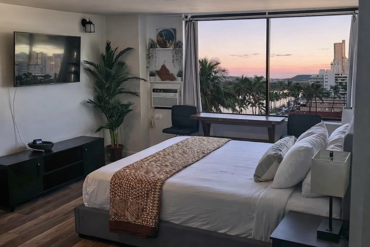 *Алоха! Ласкаво прошу до наймилішої студії у Вайкікі!* Це повністю переобладнана симпатична студія з міні-кухнею в Hawaiian Monarch. Де все розташоване в пішій доступності. Найкращий дизайн інтер’єру в стилі бохо, вид на Даймонд-Гед і річку, велике вікно на південну сторону, стіл для роботи стоячи з монітором і клавіатурою, швидкість Wi-Fi 100 Мбіт/с і проєктор для 80-дюймового екрана! НІКОЛИ НЕ ЗАНАДТО МАЛЕНЬКИЙ, щоб мати найкраще перебування в Гонолулу Оновлення у травні 2025 року, *ДЕШЕВЕ ПАРКУВАННЯ! І новий кондиціонер! Паркування коштує 20 доларів на добу