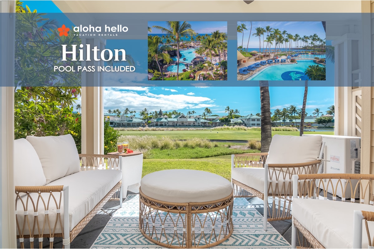 Modern designer touches with Island vibe will meet you in this tastefully upgraded ground level unit. Hilton Pool Access included. Large living room with high ceilings opens into a fully stocked, chef's kitchen and opens to lanai with expansive seating and views of golf, lake, nearby shopping plaza and gorgeous sunsets every night. Beach gear, baby gear, king beds, each room has a ceiling fan and AC, black out shades. Heated pool, starry sky, gym, hot tub, outside kitchen... perfect vacation.