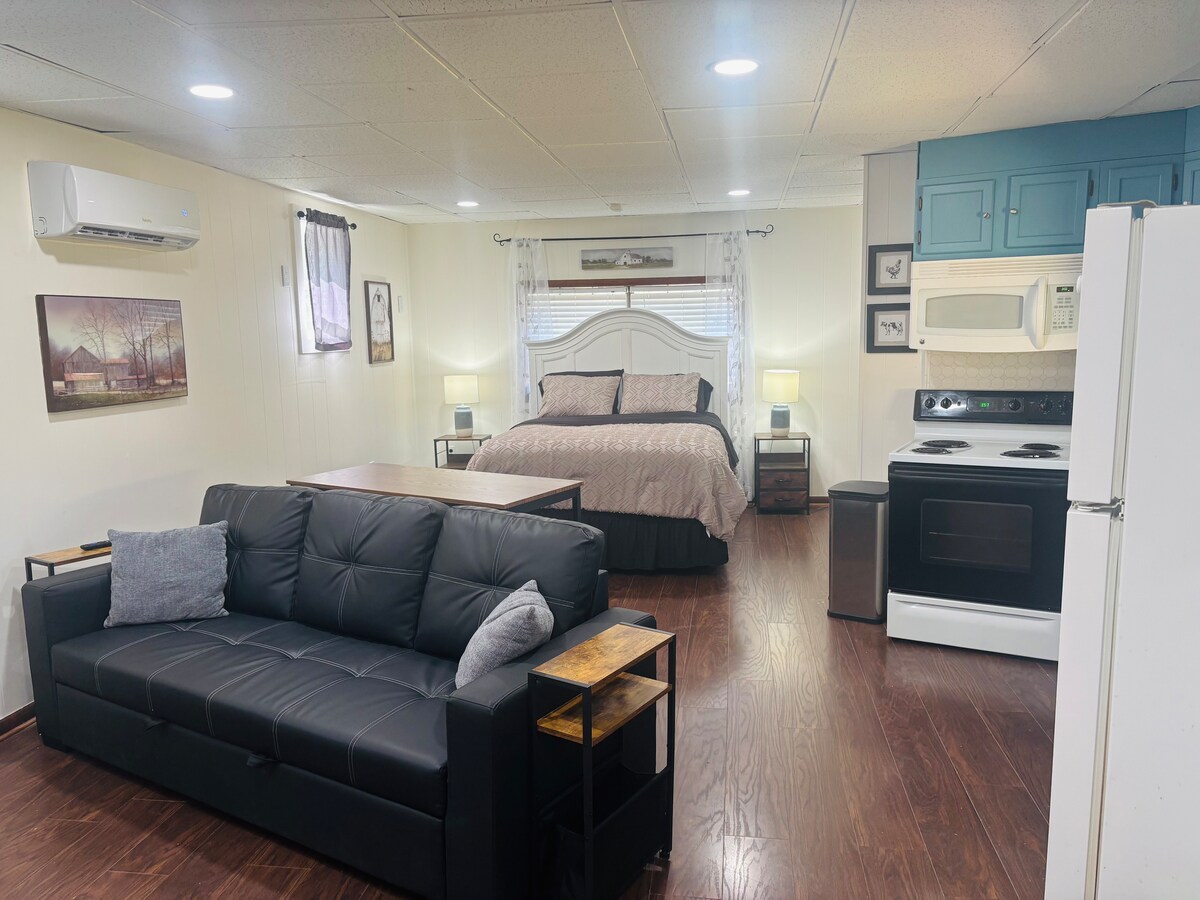 Романтичний котедж; ідеальний, унікальний заміський відпочинок. 134 кв. м відкритого планування з двоспальним ліжком розміру "king-size" в головній зоні, 75-дюймовим телевізором (Wi-Fi, телевізійні програми; без кабельного телебачення), електричними камінами, кухнею (без посудомийної машини), повнорозмірною шлюзом/душем, обідньою зоною, гардеробною, однією ванною кімнатою з душем та ванною.Прилегле приміщення відділене шторами та меблями, а не стінами/дверима. Включає двоспальне кушетку з спливним багажником, що робить його королем. Розташований на 20 огороджених акрах із безпечним в’їздом, місцем для багаття та ставком для риболовлі, який не розчарує!