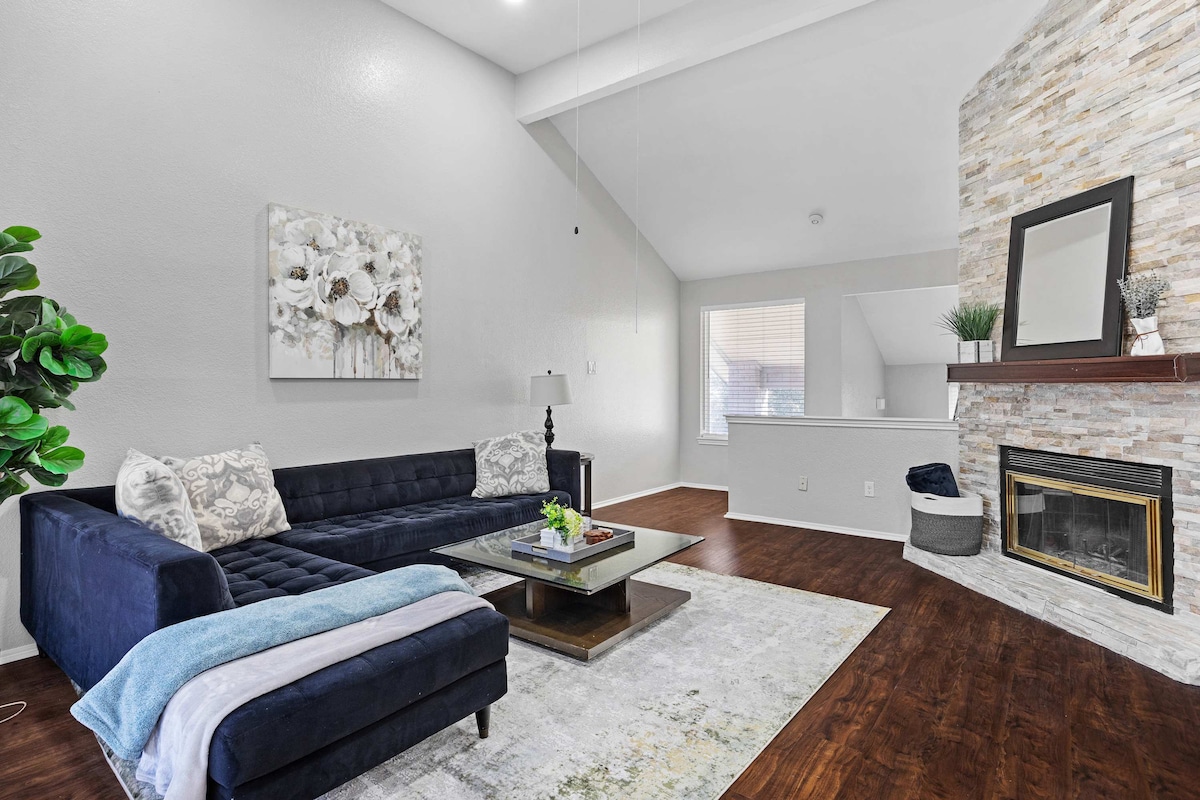 Насолоджуйтесь стильним будинком у центрі міста, поруч із торговим центром Grandscapes. 3 спальні, 2 ванні кімнати, 2 спальні, умивальник/сушильник, повністю обладнана кухня, обідня зона, 65-дюймовий Smart TV у великій спальні, безкоштовний високошвидкісний Wi-Fi, 55-дюймовий Smart TV у спальні, поруч із Grandscapes, північною та западною частинами Далласа, Даллас Парквей, American Airlines Center (Dallas Mavs & Stars), футбольним клубом HOF, футбольним клубом MLS Dallas, Frisco Rough Riders, багатьма сучасними апартаментами.Парки, аквапарк Hawaiian Waters, гольф-клуб Top Golf, ексклюзивні магазини та ресторани. Ez drive до розважального району Арлінгтона. Збір за порушення правил – 1000 доларів США