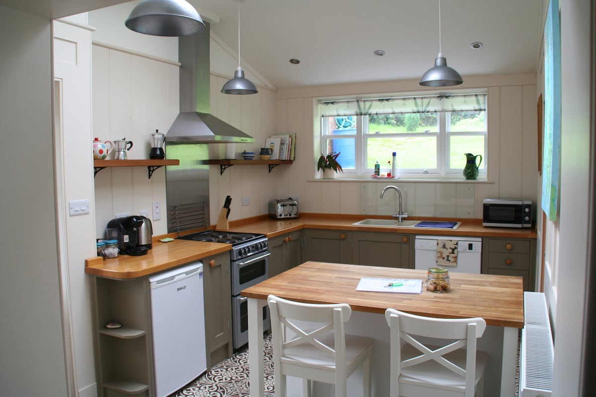 Історичний повністю відремонтований сарай, прикріплений до нашого традиційного валлійського будинку. Маючи спальню в мезоніні з двоспальним ліжком, що має доступ до неї через красиві спіральні сходи. На нижньому поверсі розташована вечеря на кухні для відпочинку відкритої плани з дров 'яною плитою та красивою люстрою. Кухня добре обладнана, включаючи електричну духовку/варильну поверхню, посудомийну машину, пральну машину, мікрохвильову піч та кулер для вина. Великі вікна знаходяться в передній і задній частині помешкання з найдивовижнішими краєвидами.