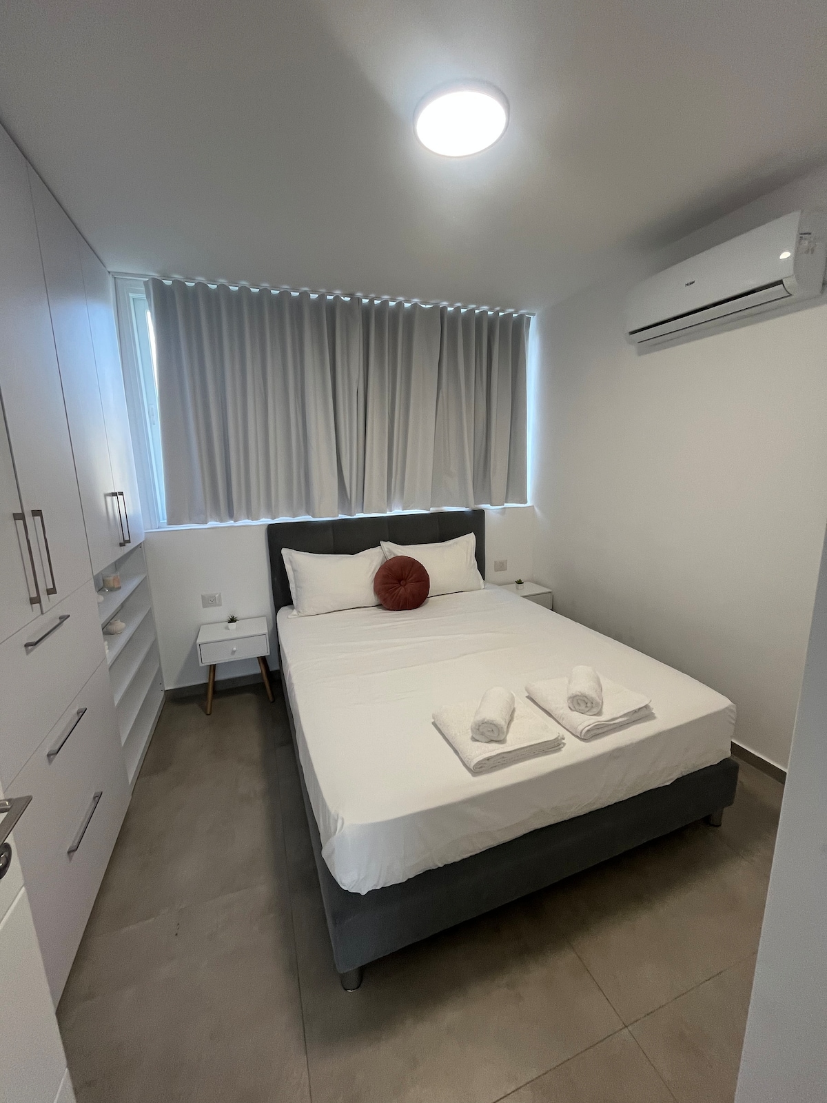 Welcome to this elegant and thoughtfully designed apartment in the heart of Herzliya. With stylish contemporary furniture, warm yellow accents, and curated lighting and artwork, the space feels both modern and inviting. Perfectly suited for up to four guests, it offers two spacious bedrooms, each with twin beds and ample storage — ideal for families, friends, or business travelers.