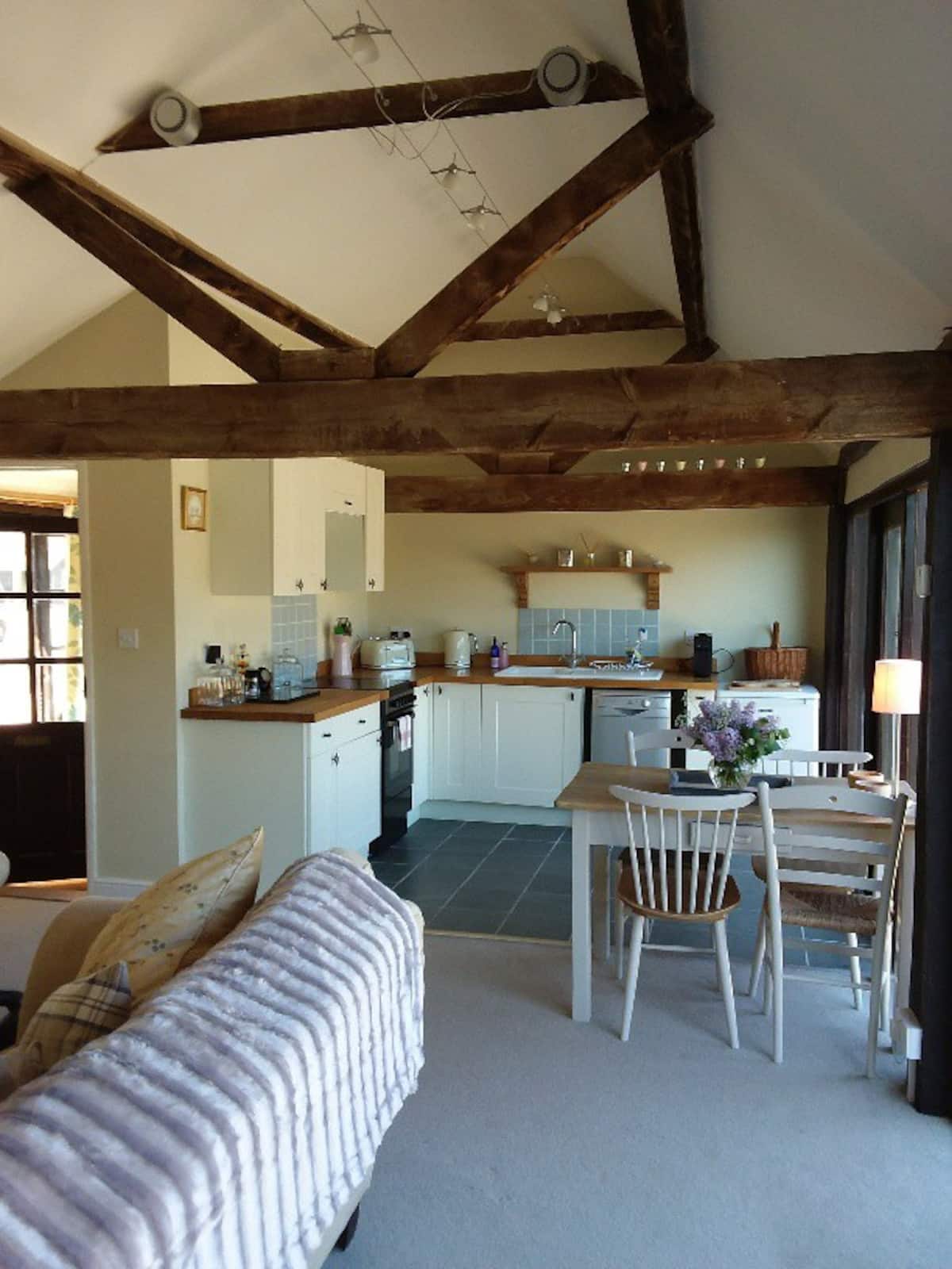 Амбар із дубовими балками в Сассексі, перетворений на чудово теплий, яскравий і чистий гостьовий будинок. Розташоване в сільській місцевості Сассексу, далеко від будь-якого руху в невеликому сільському анклаві в Національному парку Саут-Даунс, недалеко від селища Хенфілд. Лише 8 миль від Брайтону. Окремий вхід та парковка від головного будинку. Ліжко king-size, диван, великий стіл і крісло, кухонний стіл у фермерському будинку, холодильник, чайник, тостер, мікрохвильова піч з грилем. Ванна кімната з душем. Підлога з опаленням. Надзвичайно швидкий Wi-Fi. Інтелектуальний телевізор.