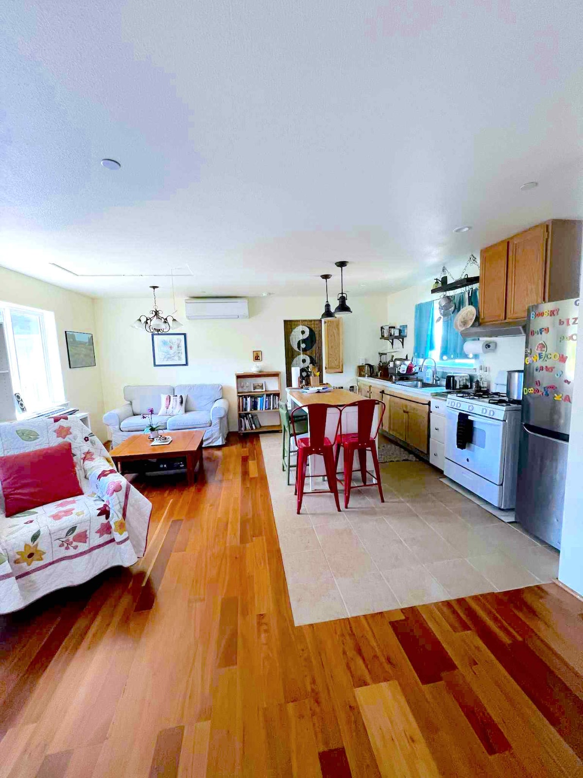 Tangerine Lodge отримує свою назву з мого прекрасного дивана мандаринового кольору, який прикрашає вітальню. Увійшовши у двері, ви захочете посидіти і розслабитися під високими стелями. Звідти можна натиснути на електричний камін для опалення або атмосфери та подивитися новий телевізор із плоским екраном. Нові пінопластові матраци, матраци чекають на вас у спальні, а зарядні станції на кожному тумбочці. Харбін знаходиться всього в трьох милях від дороги, а до долини Напа - за 20 футів.