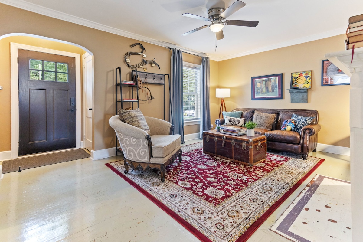Ласкаво просимо до арт-готелю West Salem! Ця еклектична та красива квартира знаходиться в історичній цегляній будівлі 1931 року, в декількох кроках від центру Вінстон-Сейлема і в 3 хвилинах ходьби від парку Truist Ballpark! Він розташований так близько до центру міста без міського шуму, і він розташований посеред тихого міського саду! Безкоштовна парковка! У декількох хвилинах ходьби від найкращих їдалень/розваг W-S! Приватний, унікальний і чистий!