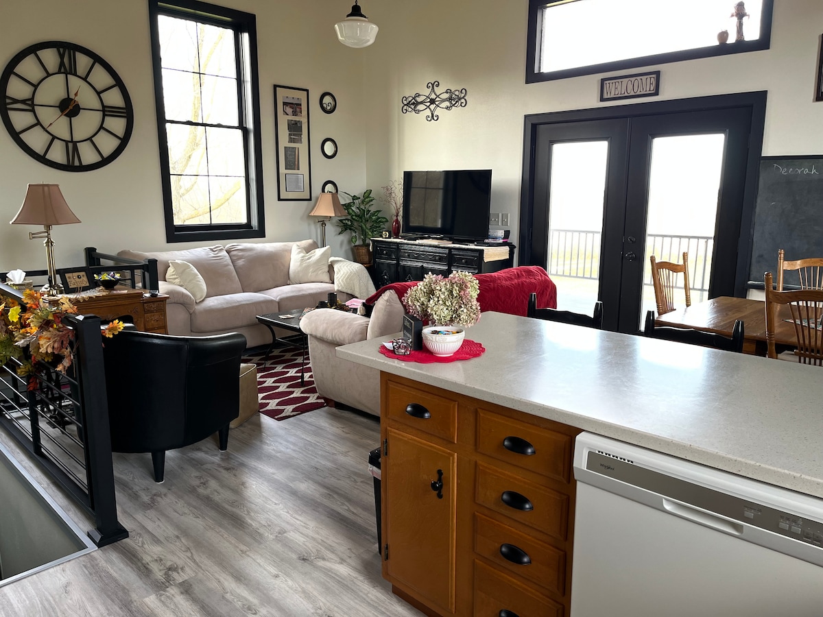 Це повністю окреме помешкання площею 120 кв. м розташоване всього в 2 хвилинах на північ від Декори на шосе 52. У ньому є повністю обладнана кухня, 2 великі спальні, 1 ванна кімната, 3 ліжка розміру queen-size та спальні місця для 6 осіб! У цьому помешканні є великий острів на 6 осіб, де можна насолодитися вечерею та/або напоями з родиною та друзями, або винести їх на підняту терасу та насолодитися краєвидом. Ми знаходимося всього в 2 хвилинах від стежки Траут-Ран, річки Верхня Айова та коледжу Лютер, який розташований просто внизу пагорба. Наш чудовий центр міста Декора знаходиться всього за 5 хвилин.