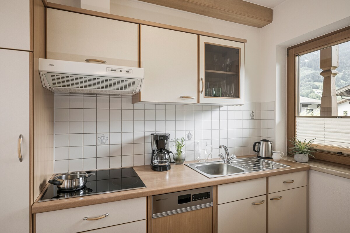 With us you can expect a cozy apartment with a beautiful view of the Zillertal mountains. The apartment offers you a bedroom with a double bed and a single bed, a well-equipped kitchen with sofa and TV, a bathroom with shower and a separate toilet. There is a covered terrace with seating available. In addition, we offer you free Wi-Fi, a free parking space directly in front of the house and a free ski boot dryer.