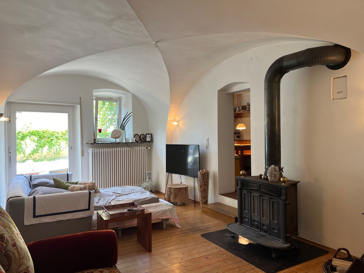 Unsere Ferienwohnung ist neu. Sie hat eine voll ausgestattet kleine Küche. Die Wohnung liegt in einem ruhigen, mediterran angelegten Hinterhof. Im Sommer gibt es dort einen Sitzplatz u. eine Feuerstelle. Fahrräder können im Hof oder in unserer Fahrradwerkstatt untergestellt werden. Dort gibt es auch Werkzeug für eventuelle Reparaturen und einen Stromanschluss für E-Bikes. Wir führen auf Wunsch und nach Anmeldung Weinverkostungen durch. Frühstück gibt es auf Anfrage, auch vegan.
