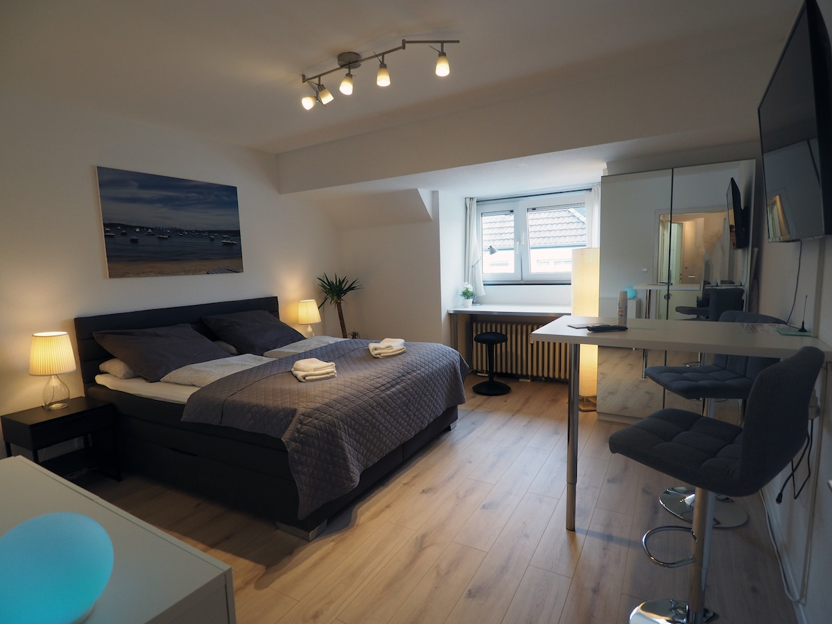 Сонячна ексклюзивна 1-кімнатна квартира в центрі Кельна для 1-2 осіб; відкритий план поверху, підігрів підлоги, зручне ліжко (1,40 х 2 м), стильна вітальня, кухня, високоякісні вбудовані меблі; сучасний дизайн ванної кімнати з денним світлом / ексклюзивними меблями; високошвидкісний Wi-Fi до 100 мбіт/с; продуманий дизайн освітлення 3 хвилини до торгових вулиць, ресторанів і барів на порозі, 800 метрів до собору, автострада A57 на автомобілі за 5 хвилин. Бронювання тривалістю від 90 днів за запитом.
