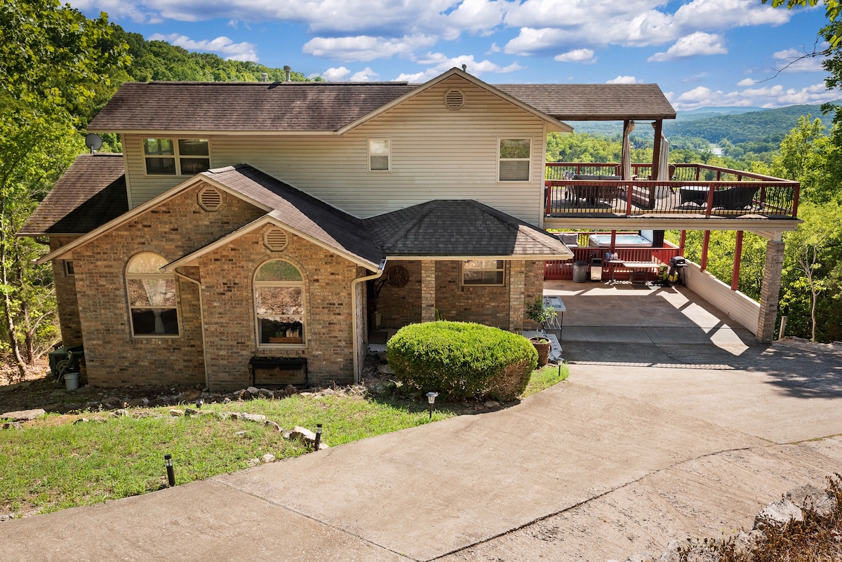 Ваша сім 'я буде насолоджуватися приватністю наприкінці дороги з захоплюючими видами на гори та блефом з 3 окремих палуб. Гідромасажна ванна на 7 осіб - чудовий спосіб розслабитися після дня вивчення цього району. Одна щаслива пара матиме власну терасу з основним люксом із диваном для відпочинку на відкритому повітрі. У ігровій кімнаті на цокольному поверсі є басейн, стіл для пінг-понгу та смарт-телевізор, що забезпечує години веселощів і розваг. Від критого паркінгу на 2 автомобілі - всього 1,5 милі до човна та пристані
