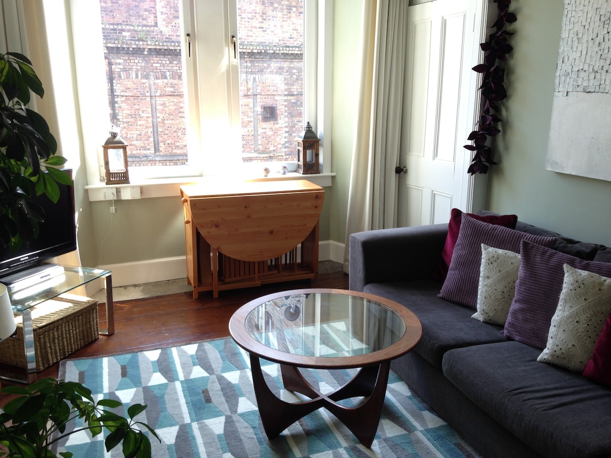 Стильна, комфортабельна квартира на 2-му поверсі в традиційному вікторіанському таунхаусі, у зеленому районі Едінбурга Еббіхілл, належить шотландському художнику. Квартира ідеально розташована на тихій вулиці, але недалеко від центру міста. У декількох хвилинах ходьби від Королівської милі, палацу та парку Холіруд, Калтон-Гілл, шотландського парламенту та Старого міста. Легкий сніданок включено у вартість — круасани/варення, кава, чай та молоко. Поруч багато магазинів, кафе, пабів і парків.