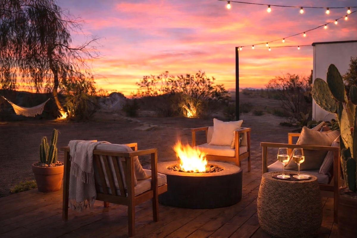 Ласкаво просимо на ранчо Coral & Cacti – у джунглові Джошуа-Трі. Приготуйте власну піцу та насолоджуйтеся чудовими краєвидами на пустелю, лежачи на підвісних ліжках на відкритому повітрі. Насолодіться зоряним небом у нашій гідромасажній ванні або басейні. Цей барвистий богемний затишок є улюбленим місцем гостей. - дров 'яна піч для піци; - душ на відкритому повітрі; - місце для багаття; – гідромасажна ванна під зоряним небом. - патіо з підвісними ліжками - ковбойський басейн; – проектор для трансляції, ноутбук - швидкий Wi-Fi; - подвійний душ у приміщенні; - гамаки; Обрано одним із найкращих помешкань Airbnb у Джошуа-Трі!