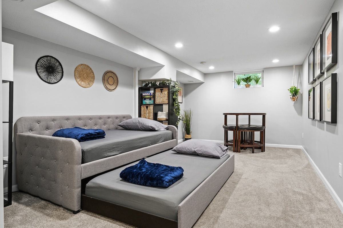 Відпочинок у верхньому дуплексі для перебувань тривалістю 6 ночей і більше для професіоналів, які подорожують, комфортно під час відвідування сім 'ї та друзів, поблизу парків, озер, розташованих в центрі міста з легким доступом, 10 хвилин до центру міста, 15 хвилин від MOA та аеропорту. Багато ресторанів і магазинів поблизу. Зручне розташування поблизу методистської лікарні. Хайленд-Парк - 10 хвилин їзди на зимових лижах, літній ігровий майданчик. Повністю мебльована кухня для приготування домашньої їжі. Окремий вхід і реєстрація за допомогою дверного коду.