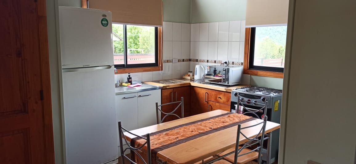 Затишна хатинка з власною кухнею з 2 спальнями, вміщує 4 дорослих. Повністю обладнана кухня, включаючи 2-конфоркову газову плиту, електричну духовку, холодильник і кухонне приладдя. Ванна кімната з душем з гарячою водою. Відкривається на приватний балкон із чудовим видом на Патагонію. Надається постільна білизна, рушники. З парковкою. Ідеальне місце для відпочинку з родиною або друзями під час подорожі чилійською Патагонією. Зверніть увагу, що до хатини можна дістатися, пройшовши пішки через сільську місцевість.
