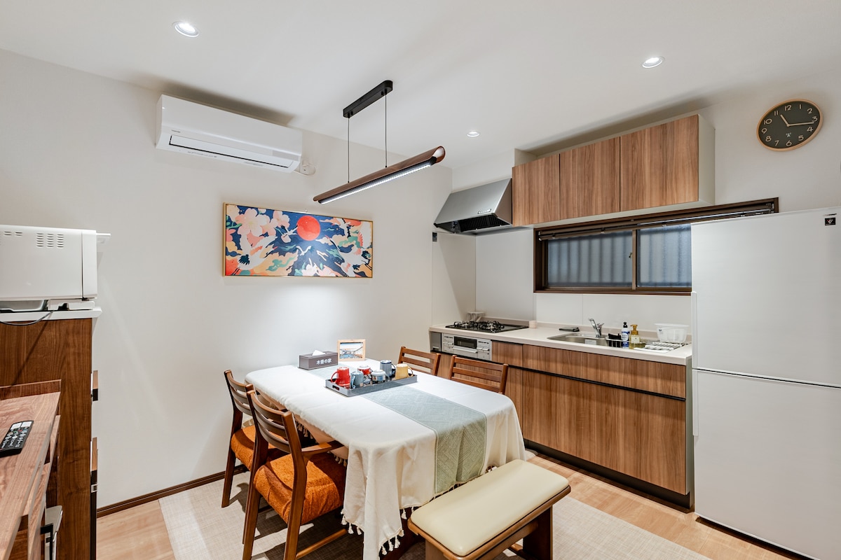 Ласкаво просимо до «TabiTime・Sumiyoshi Sumikaze①»! Цей двоповерховий будинок має чарівний дизайн епохи Тайшо, площею приблизно 40 кв. м і вміщує до 4 гостей. Розташований у тихому районі Сумійоші, він знаходиться за 5 хвилин ходьби від храму Сумійоші і парку Сумійоші, де можна насолодитися місцевою культурою подалі від туристичних натовпів. Легкий доступ залізницею Nankai та трамваєм Hankai до Намби, Теннодзі та аеропорту Кансай. Професійне прибирання на рівні готелю та постільна білизна для чистого та комфортного перебування.